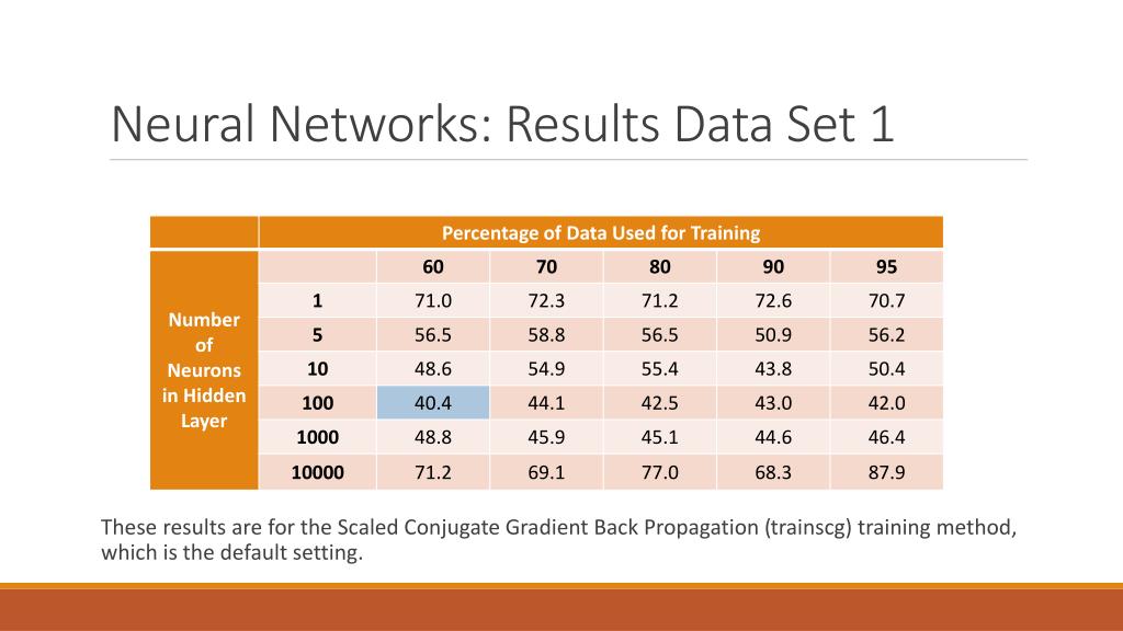 Neural Networks: Results Data Set 1 These results are for the Scaled Conjugate Gradient Back Propagation (trainscg) training method, which is the default setting.