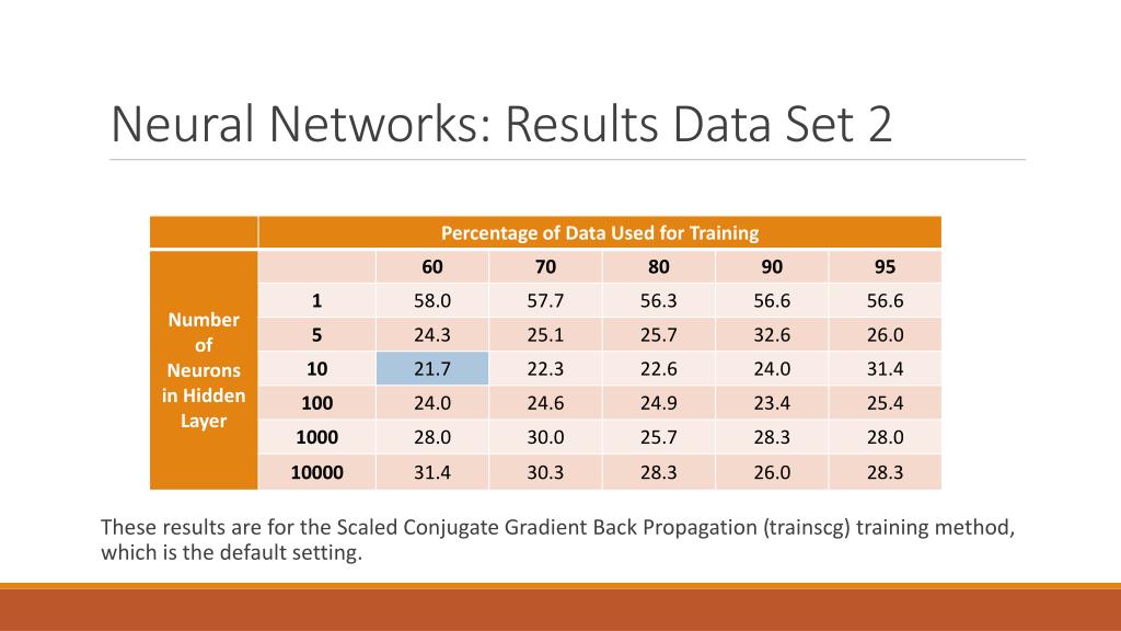 Neural Networks: Results Data Set 2 These results are for the Scaled Conjugate Gradient Back Propagation (trainscg) training method, which is the default setting.