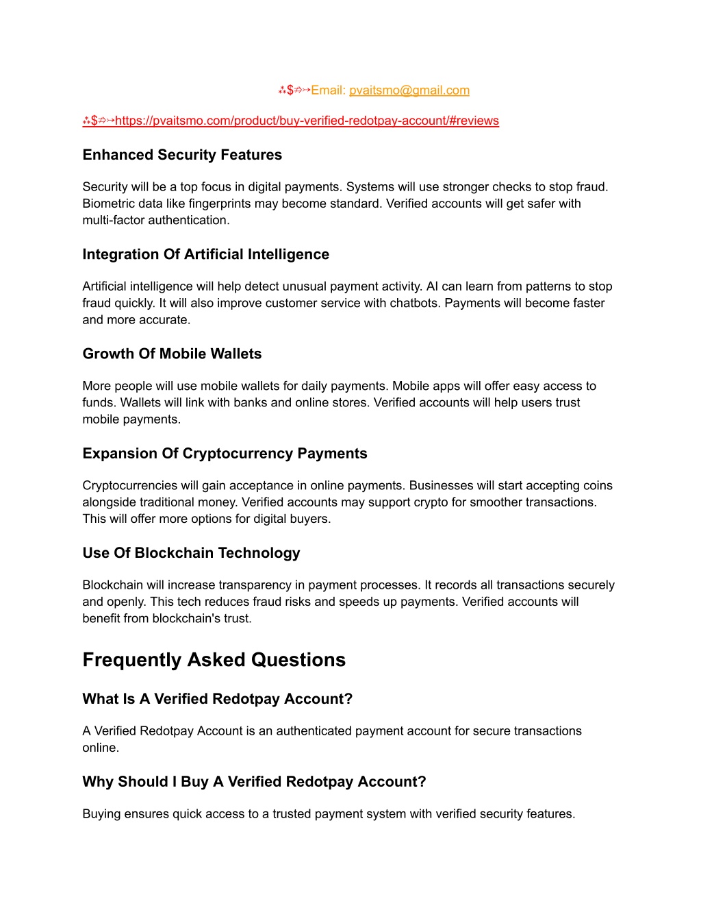 ⁂$⇏↣Email: pvaitsmo@gmail.com ⁂$⇏↣https://pvaitsmo.com/product/buy-verified-redotpay-account/#reviews Enhanced Security Features Security will be a top focus in digital payments. Systems will use stronger checks to stop fraud. Biometric data like fingerprints may become standard. Verified accounts will get safer with multi-factor authentication. Integration Of Artificial Intelligence Artificial intelligence will help detect unusual payment activity. AI can learn from patterns to stop fraud quickly. It will also improve customer service with chatbots. Payments will become faster and more accurate. Growth Of Mobile Wallets More people will use mobile wallets for daily payments. Mobile apps will offer easy access to funds. Wallets will link with banks and online stores. Verified accounts will help users trust mobile payments. Expansion Of Cryptocurrency Payments Cryptocurrencies will gain acceptance in online payments. Businesses will start accepting coins alongside traditional money. Verified accounts may support crypto for smoother transactions. This will offer more options for digital buyers. Use Of Blockchain Technology Blockchain will increase transparency in payment processes. It records all transactions securely and openly. This tech reduces fraud risks and speeds up payments. Verified accounts will benefit from blockchain's trust. Frequently Asked Questions What Is A Verified Redotpay Account? A Verified Redotpay Account is an authenticated payment account for secure transactions online. Why Should I Buy A Verified Redotpay Account? Buying ensures quick access to a trusted payment system with verified security features.