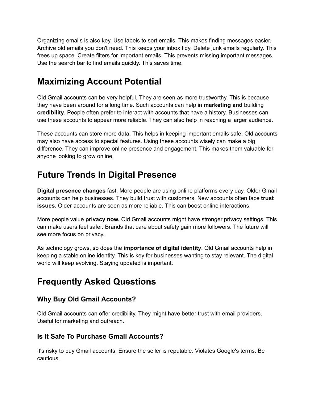 Organizing emails is also key. Use labels to sort emails. This makes finding messages easier. Archive old emails you don't need. This keeps your inbox tidy. Delete junk emails regularly. This frees up space. Create filters for important emails. This prevents missing important messages. Use the search bar to find emails quickly. This saves time. Maximizing Account Potential Old Gmail accounts can be very helpful. They are seen as more trustworthy. This is because they have been around for a long time. Such accounts can help in marketing and building credibility. People often prefer to interact with accounts that have a history. Businesses can use these accounts to appear more reliable. They can also help in reaching a larger audience. These accounts can store more data. This helps in keeping important emails safe. Old accounts may also have access to special features. Using these accounts wisely can make a big difference. They can improve online presence and engagement. This makes them valuable for anyone looking to grow online. Future Trends In Digital Presence Digital presence changes fast. More people are using online platforms every day. Older Gmail accounts can help businesses. They build trust with customers. New accounts often face trust issues. Older accounts are seen as more reliable. This can boost online interactions. More people value privacy now. Old Gmail accounts might have stronger privacy settings. This can make users feel safer. Brands that care about safety gain more followers. The future will see more focus on privacy. As technology grows, so does the importance of digital identity. Old Gmail accounts help in keeping a stable online identity. This is key for businesses wanting to stay relevant. The digital world will keep evolving. Staying updated is important. Frequently Asked Questions Why Buy Old Gmail Accounts? Old Gmail accounts can offer credibility. They might have better trust with email providers. Useful for marketing and outreach. Is It Safe To Purchase Gmail Accounts? It's risky to buy Gmail accounts. Ensure the seller is reputable. Violates Google's terms. Be cautious.