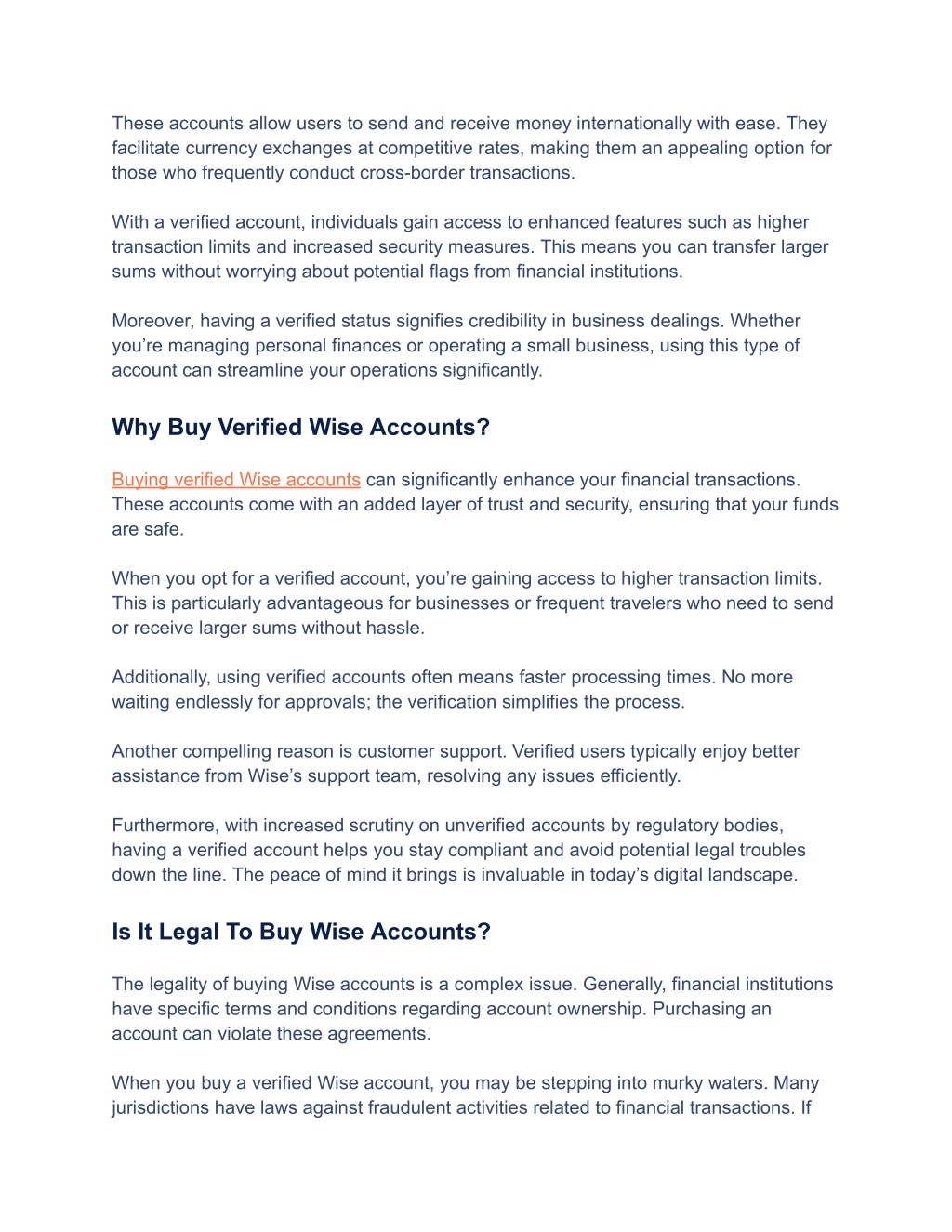 the seller has engaged in illicit practices, you could face legal repercussions. It’s essential to understand that while some people might sell verified accounts legally, others operate outside the law. Always do your due diligence before making any purchase. Consulting with a legal expert familiar with digital finance regulations can provide clarity on this matter. Protect yourself by knowing the risks involved and ensuring you’re not inadvertently participating in illegal activity when considering to buy verified Wise accounts. How To Buy Verified Wise Accounts Safely? When looking to buy a verified Wise account, safety should be your top priority. Start by conducting thorough research on potential sellers. Check their online presence and reviews from previous buyers. Use trusted marketplaces that specialize in account sales. These platforms often have measures in place to protect both parties involved. Ensure the seller offers some form of buyer protection or guarantees. Communicate directly with the seller before making any transactions. Ask questions about the account and request additional information if needed. Always opt for secure payment methods that offer dispute resolution options, such as PayPal or credit cards. Avoid wire transfers, which can be difficult to reverse. Never rush into a purchase without feeling confident about the legitimacy of the account and seller. Taking these steps helps ensure you make a safe investment in your financial future. Conclusion When it comes to managing international transactions, having a verified Wise account can be a game-changer. These accounts not only enhance your financial security but also provide you with increased flexibility for sending and receiving funds across borders. Choosing to buy verified Wise accounts is an option that many people are considering. It opens doors to various benefits like higher transaction limits and added safety