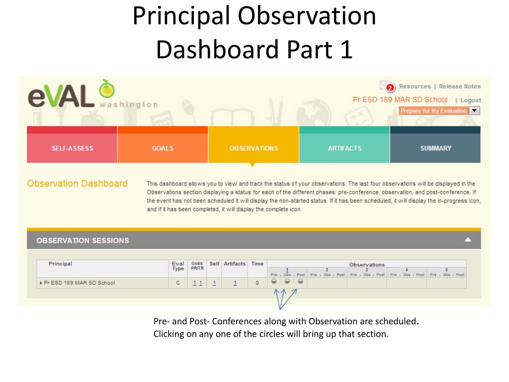 Principal Observation Dashboard Part 1 Pre- and Post- Conferences along with Observation are scheduled. Clicking on any one of the circles will bring up that section.