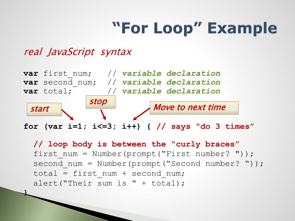 “For Loop” Example Need to do this 500,000 times? var first_num; // variable declaration var second_num; // variable declaration vartotal; // variable declaration // user should get a cup of coffee and settle in … // here comes a LOT of data input typing for (var i=1; i<=500000; i++) { first_num = Number(prompt(“First number? ")); second_num= Number(prompt(“Second number? “)); total = first_num + second_num; alert(“Their sum is “ + total); } stop