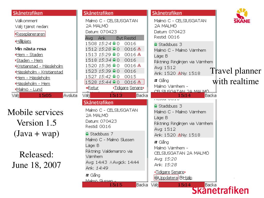 Mobile services at Skånetrafiken. Copenhagen meeting, June 19, 2007 By Krister Nordland/Anders Vårmy. Mobile services: Travel planner, departure/stop, static timetable. 600 users/day 1000-1500 searches/day. Travel planner with realtime. Mobile services Version 1.5 (Java + wap)