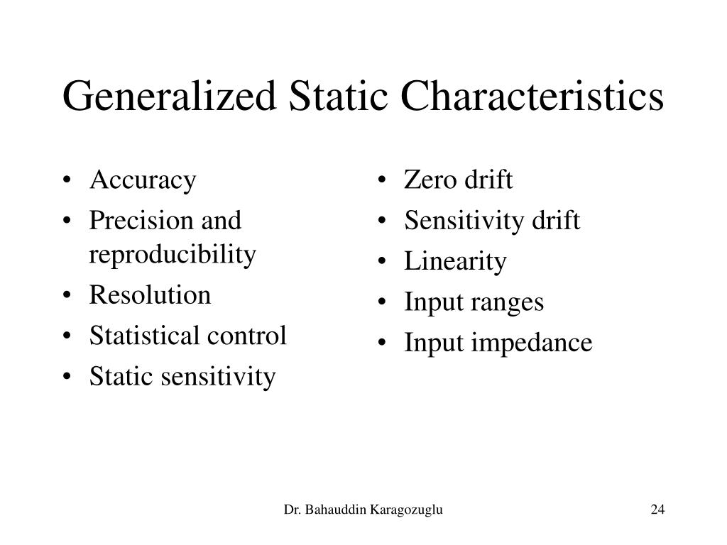 Accuracy Precision and reproducibility Resolution Statistical control Static sensitivity Zero drift Sensitivity drift Linearity Input ranges Input impedance Generalized Static Characteristics Dr. Bahauddin Karagozuglu