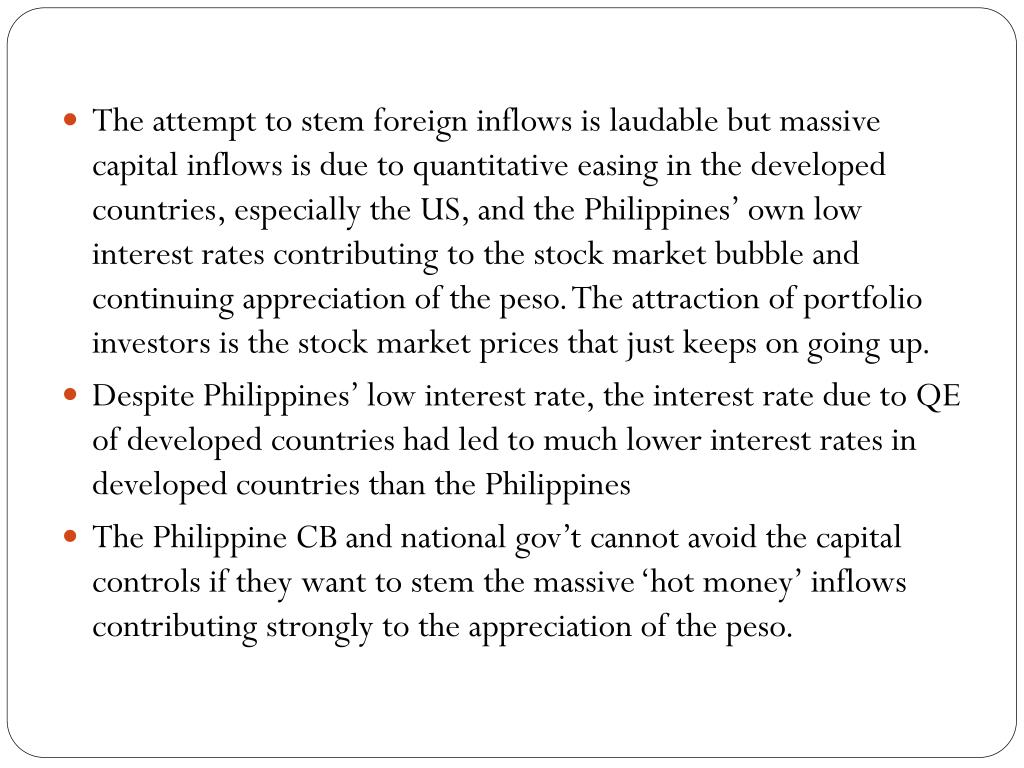 The attempt to stem foreign inflows is laudable but massive capital inflows is due to quantitative easing in the developed countries, especially the US, and the Philippines’ own low interest rates contributing to the stock market bubble and continuing appreciation of the peso. The attraction of portfolio investors is the stock market prices that just keeps on going up. • Despite Philippines’ low interest rate, the interest rate due to QE of developed countries had led to much lower interest rates in developed countries than the Philippines • The Philippine CB and national gov’t cannot avoid the capital controls if they want to stem the massive ‘hot money’ inflows contributing strongly to the appreciation of the peso.