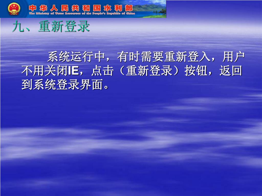 九、重新登录 系统运行中,有时需要重新登入,用户不用关闭IE,点击(重新登录)按钮,返回到系统登录界面。