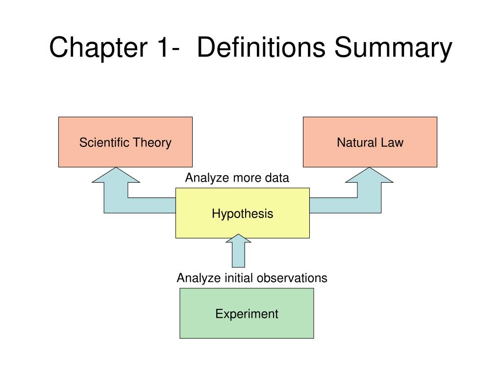 Chapter 1- Definitions Summary Scientific Theory Natural Law Analyze more data Hypothesis Analyze initial observations Experiment