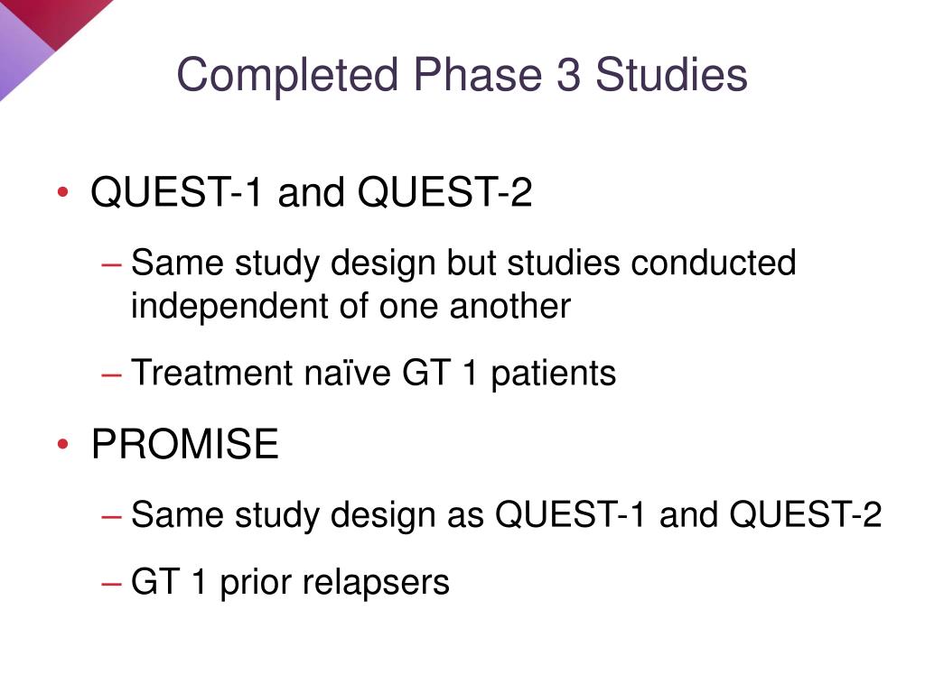 Completed Phase 3 Studies • QUEST-1 and QUEST-2 • Same study design but studies conducted independent of one another • Treatment naïve GT 1 patients • PROMISE • Same study design as QUEST-1 and QUEST-2 • GT 1 prior relapsers