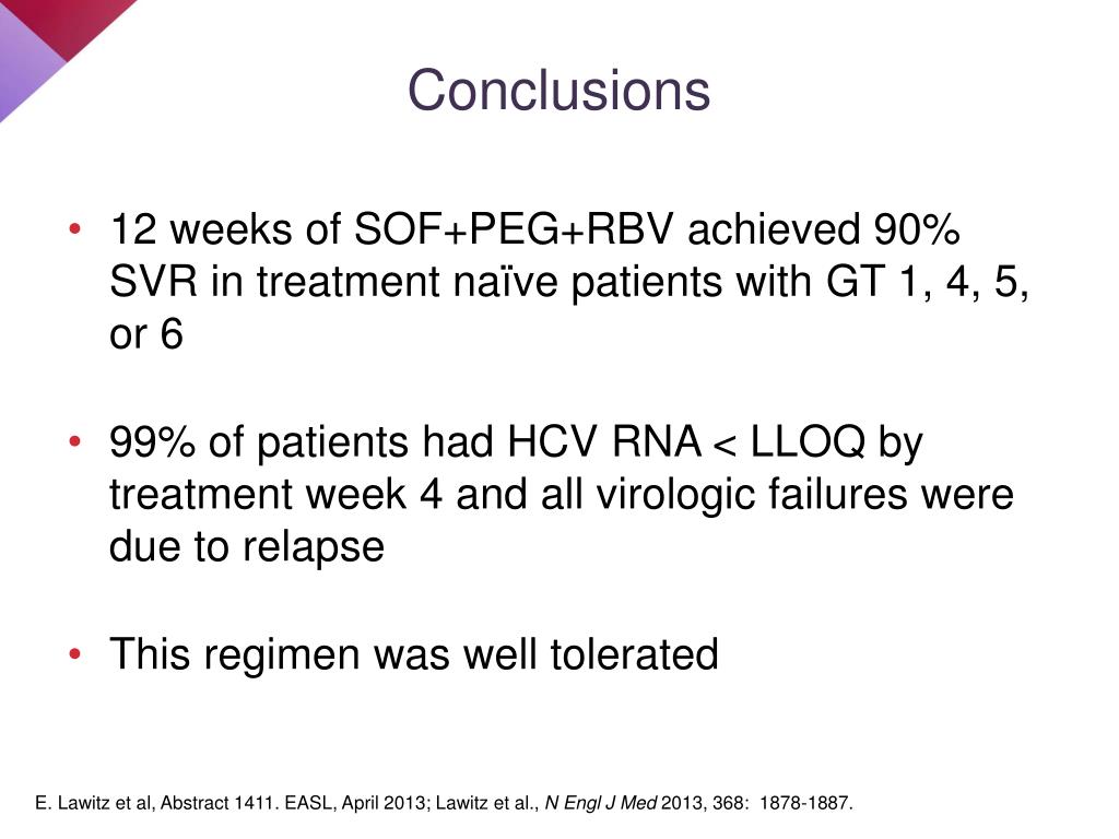 Conclusions • 12 weeks of SOF+PEG+RBV achieved 90% SVR in treatment naïve patients with GT 1, 4, 5, or 6 • 99% of patients had HCV RNA < LLOQ by treatment week 4 and all virologic failures were due to relapse • This regimen was well tolerated E. Lawitz et al, Abstract 1411. EASL, April 2013; Lawitz et al., N Engl J Med 2013, 368: 1878-1887.