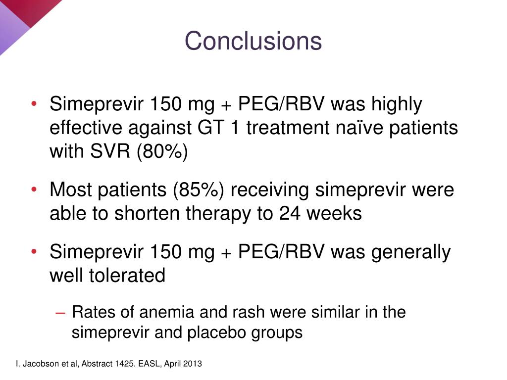 Conclusions • Simeprevir150 mg + PEG/RBV was highly effective against GT 1 treatment naïve patients with SVR (80%) • Most patients (85%) receiving simeprevirwere able to shorten therapy to 24 weeks • Simeprevir150 mg + PEG/RBV was generally well tolerated • Rates of anemia and rash were similar in the simeprevir and placebo groups I. Jacobson et al, Abstract 1425. EASL, April 2013