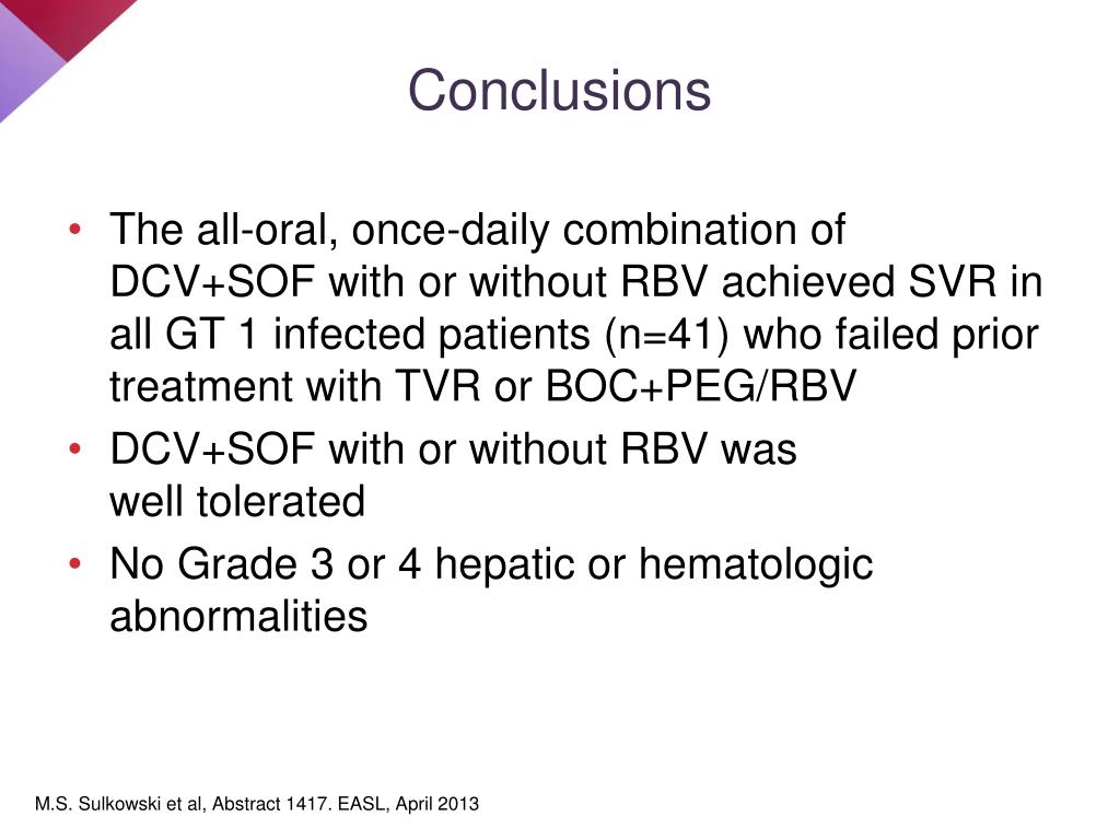 Conclusions • The all-oral, once-daily combination of DCV+SOF with or without RBV achieved SVR in all GT 1 infected patients (n=41) who failed prior treatment with TVR or BOC+PEG/RBV • DCV+SOF with or without RBV waswell tolerated • No Grade 3 or 4 hepatic or hematologic abnormalities M.S. Sulkowski et al, Abstract 1417. EASL, April 2013