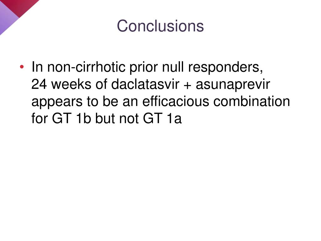 Conclusions • In non-cirrhotic prior null responders,24 weeks of daclatasvir + asunaprevir appears to be an efficacious combination for GT 1b but not GT 1a