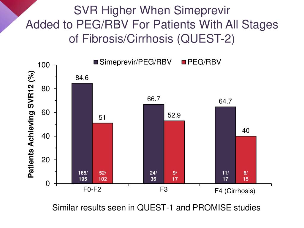 SVR Higher When SimeprevirAdded to PEG/RBV For Patients With All Stages of Fibrosis/Cirrhosis (QUEST-2) 165/ 195 52/ 102 24/ 36 9/ 17 11/ 17 6/ 15 F0-F2 F3 F4 (Cirrhosis) Similar results seen in QUEST-1 and PROMISE studies