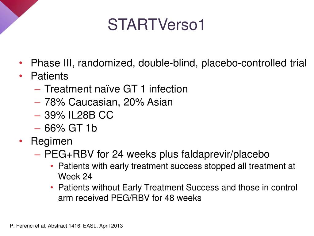 STARTVerso1 • Phase III, randomized, double-blind, placebo-controlled trial • Patients • Treatment naïve GT 1 infection • 78% Caucasian, 20% Asian • 39% IL28B CC • 66% GT 1b • Regimen • PEG+RBV for 24 weeks plus faldaprevir/placebo • Patients with early treatment success stopped all treatment atWeek 24 • Patients without Early Treatment Success and those in control arm received PEG/RBV for 48 weeks P. Ferenci et al, Abstract 1416. EASL, April 2013