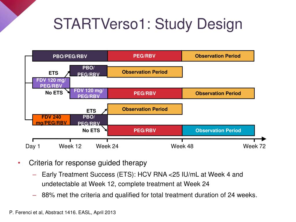PBO/PEG/RBV PEG/RBV Observation Period STARTVerso1: Study Design • Criteria for response guided therapy • Early Treatment Success (ETS): HCV RNA <25 IU/mL at Week 4 and undetectable at Week 12, complete treatment at Week 24 • 88% met the criteria and qualified for total treatment duration of 24 weeks. Observation Period ETS FDV240 mg/PEG/RBV PBO/ PEG/RBV PEG/RBV Observation Period No ETS PBO/ PEG/RBV Observation Period ETS FDV 120 mg/ PEG/RBV Observation Period FDV 120 mg/ PEG/RBV PEG/RBV No ETS Day 1 Week 12 Week 24 Week 48 Week 72 P. Ferenci et al, Abstract 1416. EASL, April 2013