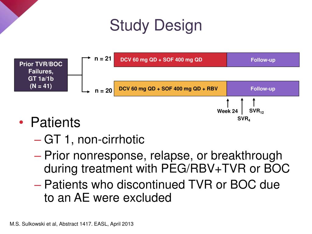 Background • Patients who experience virologic failure on telaprevir or boceprevir-based regimens currently have no treatment options • DCV plus SOF with or without RBV achieved SVR4 in 98% of 126 HCV GT 1-infected treatment-naive patients (Sulkowski et al. AASLD 2012) • Study Aim • To evaluate the efficacy and safety of DCV+SOF with or without RBV for 24 weeks in GT 1-infected patients who failed prior treatment with TVR or BOC + PEG/RBV M.S. Sulkowski et al, Abstract 1417. EASL, April 2013