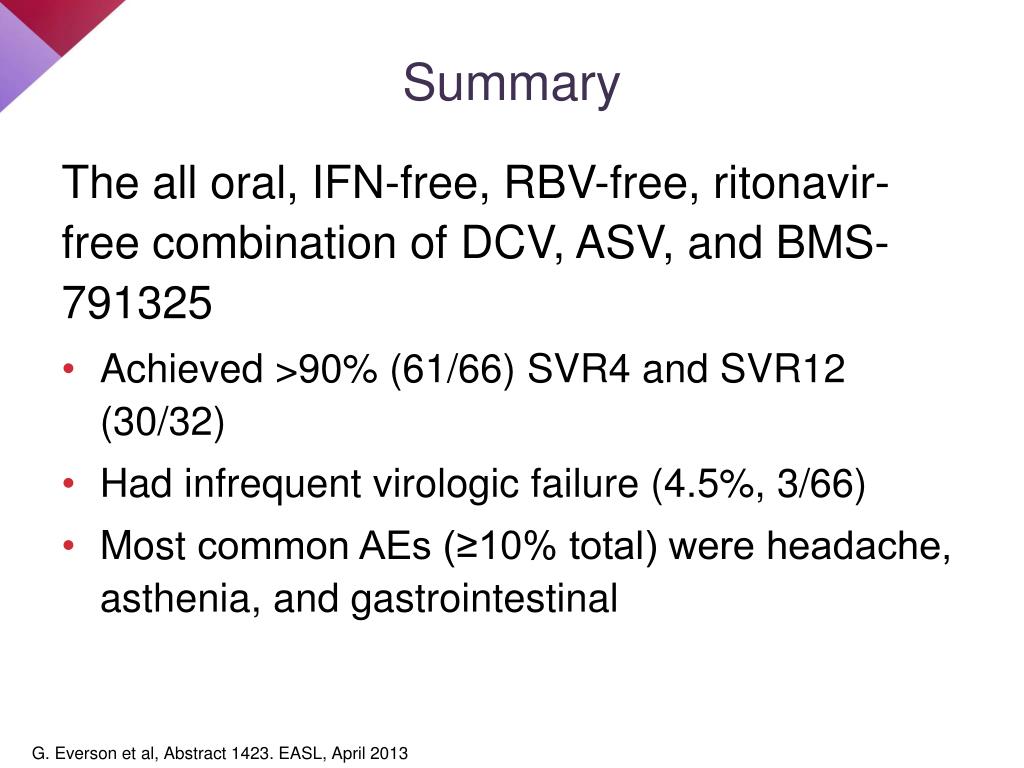 Summary The all oral, IFN-free, RBV-free, ritonavir-free combination of DCV, ASV, and BMS-791325 • Achieved >90% (61/66) SVR4 and SVR12 (30/32) • Had infrequent virologic failure (4.5%, 3/66) • Most common AEs (≥10% total) were headache, asthenia, and gastrointestinal G. Everson et al, Abstract 1423. EASL, April 2013