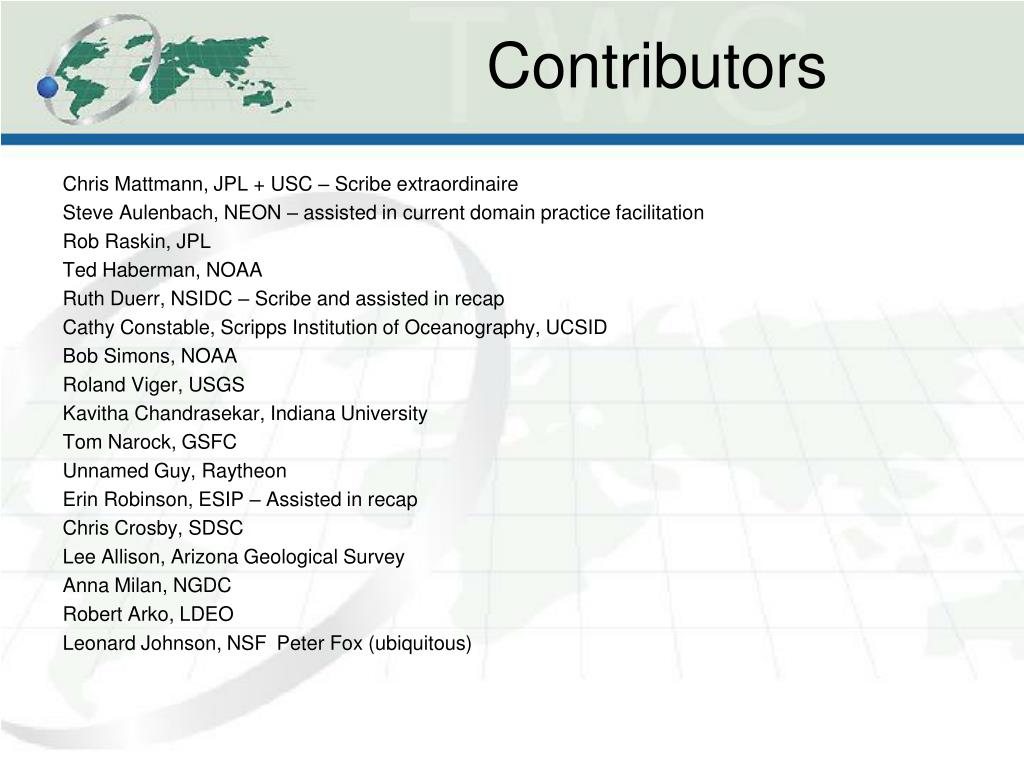 Contributors Chris Mattmann, JPL + USC – Scribe extraordinaire Steve Aulenbach, NEON – assisted in current domain practice facilitation Rob Raskin, JPL Ted Haberman, NOAA Ruth Duerr, NSIDC – Scribe and assisted in recap Cathy Constable, Scripps Institution of Oceanography, UCSID Bob Simons, NOAA Roland Viger, USGS Kavitha Chandrasekar, Indiana University Tom Narock, GSFC Unnamed Guy, Raytheon Erin Robinson, ESIP – Assisted in recap Chris Crosby, SDSC Lee Allison, Arizona Geological Survey Anna Milan, NGDC Robert Arko, LDEO Leonard Johnson, NSF Peter Fox (ubiquitous)