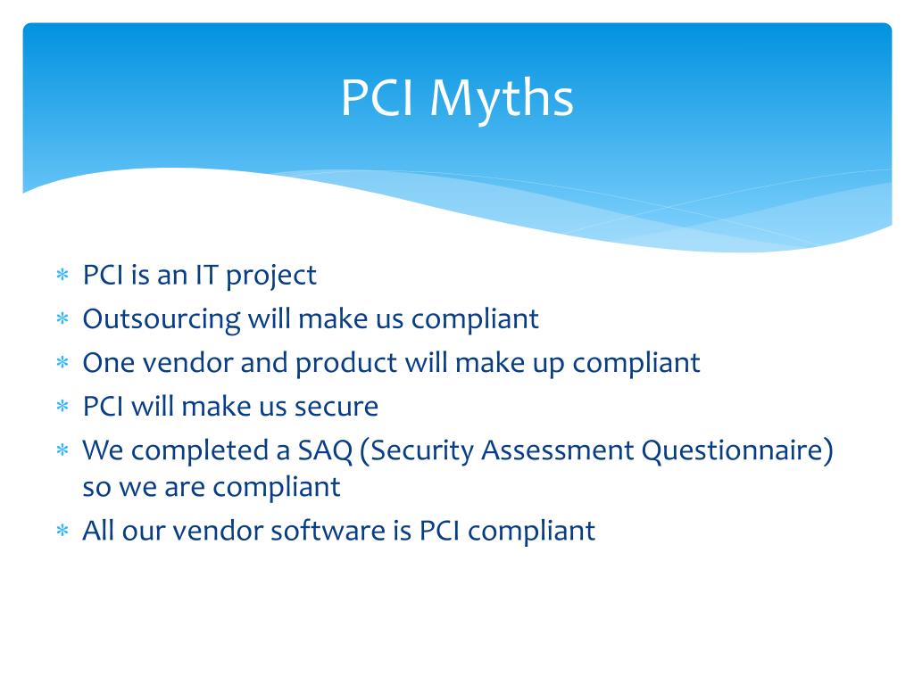 PCI Myths PCI is an IT project Outsourcing will make us compliant One vendor and product will make up compliant PCI will make us secure We completed a SAQ (Security Assessment Questionnaire) so we are compliant All our vendor software is PCI compliant