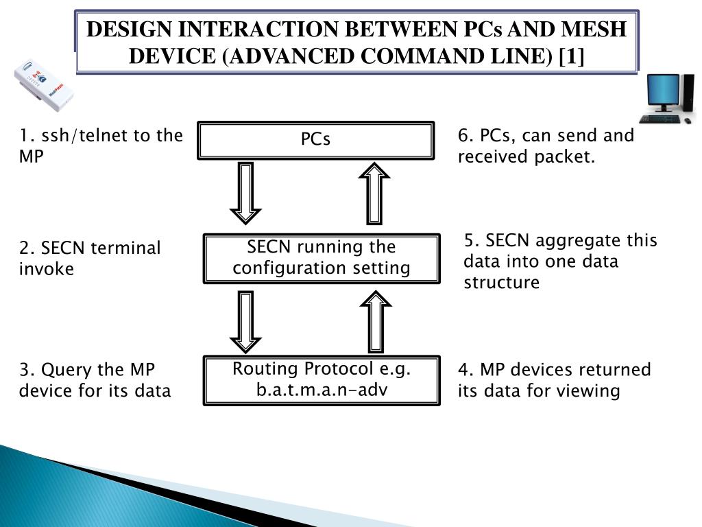 DESIGN INTERACTION BETWEEN PCs AND MESH DEVICE (ADVANCED COMMAND LINE) [1] 1. ssh/telnet to the MP PCs 6. PCs, can send and received packet. 5. SECN aggregate this data into one data structure 2. SECN terminal invoke SECN running the configuration setting 3. Query the MP device for its data Routing Protocol e.g. b.a.t.m.a.n-adv 4. MP devices returned its data for viewing
