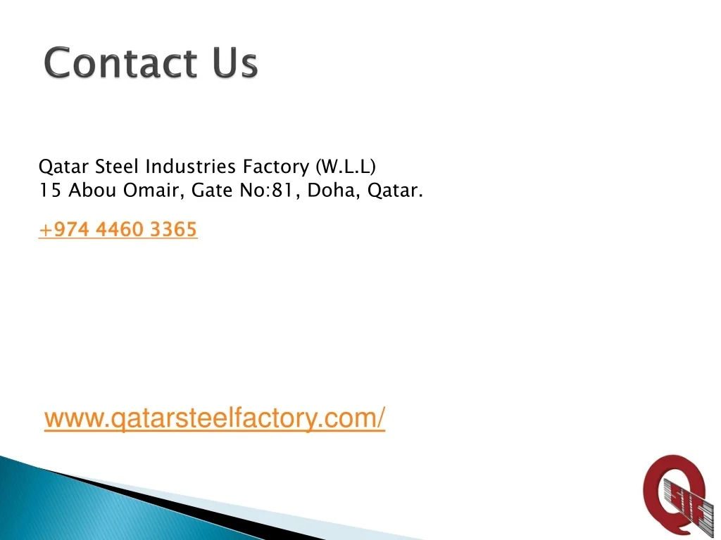 Contact Us Qatar Steel Industries Factory (W.L.L) 15 Abou Omair, Gate No:81, Doha, Qatar. +974 4460 3365 info@qatarsteelfactory.com www.qatarsteelfactory.com/