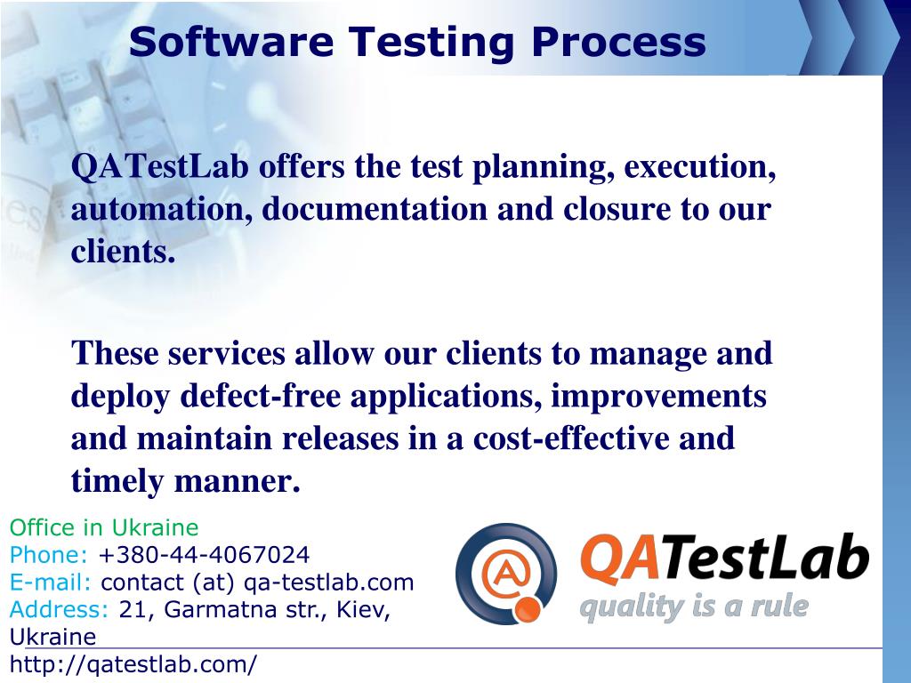Software Testing Process QATestLab offers the test planning, execution, automation, documentation and closure to our clients. These services allow our clients to manage and deploy defect-free applications, improvements and maintain releases in a cost-effective and timely manner. Office in Ukraine Phone: +380-44-4067024 E-mail: contact (at) qa-testlab.com Address: 21, Garmatna str., Kiev, Ukraine http://qatestlab.com/