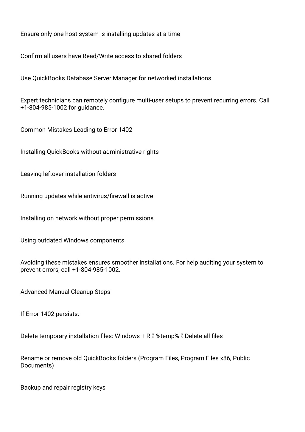 13. Ensure only one host system is installing updates at a time Confirm all users have Read/Write access to shared folders Use QuickBooks Database Server Manager for networked installations Expert technicians can remotely configure multi-user setups to prevent recurring errors. Call +1-804-985-1002 for guidance. Common Mistakes Leading to Error 1402 Installing QuickBooks without administrative rights Leaving leftover installation folders Running updates while antivirus/firewall is active Installing on network without proper permissions Using outdated Windows components Avoiding these mistakes ensures smoother installations. For help auditing your system to prevent errors, call +1-804-985-1002. Advanced Manual Cleanup Steps If Error 1402 persists: Delete temporary installation files: Windows + R ? %temp% ? Delete all files Rename or remove old QuickBooks folders (Program Files, Program Files x86, Public Documents) Backup and repair registry keys