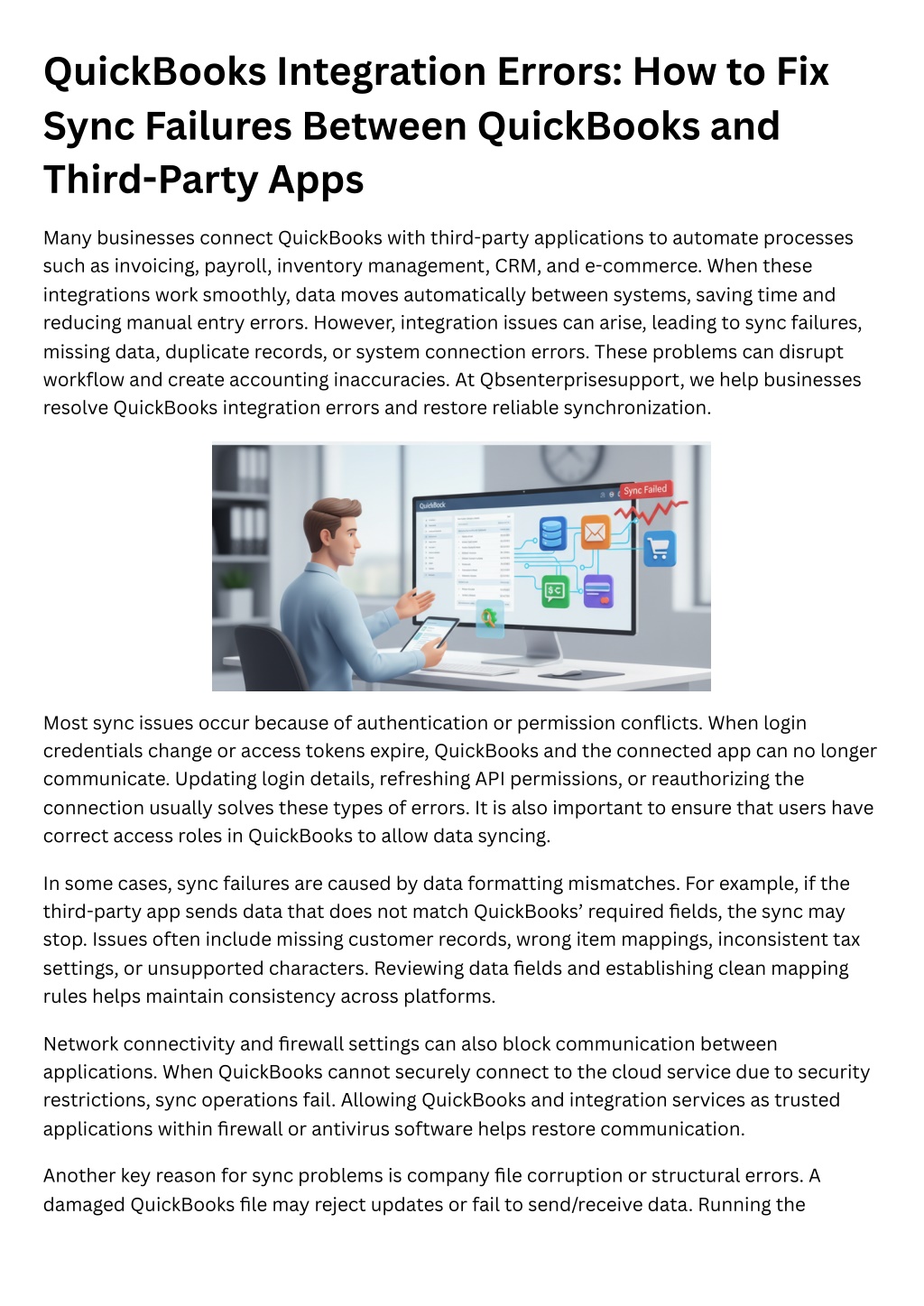 QuickBooks Integration Errors: How to Fix Sync Failures Between QuickBooks and Third-Party Apps Many businesses connect QuickBooks with third-party applications to automate processes such as invoicing, payroll, inventory management, CRM, and e-commerce. When these integrations work smoothly, data moves automatically between systems, saving time and reducing manual entry errors. However, integration issues can arise, leading to sync failures, missing data, duplicate records, or system connection errors. These problems can disrupt workflow and create accounting inaccuracies. At Qbsenterprisesupport, we help businesses resolve QuickBooks integration errors and restore reliable synchronization. Most sync issues occur because of authentication or permission conflicts. When login credentials change or access tokens expire, QuickBooks and the connected app can no longer communicate. Updating login details, refreshing API permissions, or reauthorizing the connection usually solves these types of errors. It is also important to ensure that users have correct access roles in QuickBooks to allow data syncing. In some cases, sync failures are caused by data formatting mismatches. For example, if the third-party app sends data that does not match QuickBooks’ required fields, the sync may stop. Issues often include missing customer records, wrong item mappings, inconsistent tax settings, or unsupported characters. Reviewing data fields and establishing clean mapping rules helps maintain consistency across platforms. Network connectivity and firewall settings can also block communication between applications. When QuickBooks cannot securely connect to the cloud service due to security restrictions, sync operations fail. Allowing QuickBooks and integration services as trusted applications within firewall or antivirus software helps restore communication. Another key reason for sync problems is company file corruption or structural errors. A damaged QuickBooks file may reject updates or fail to send/receive data. Running the