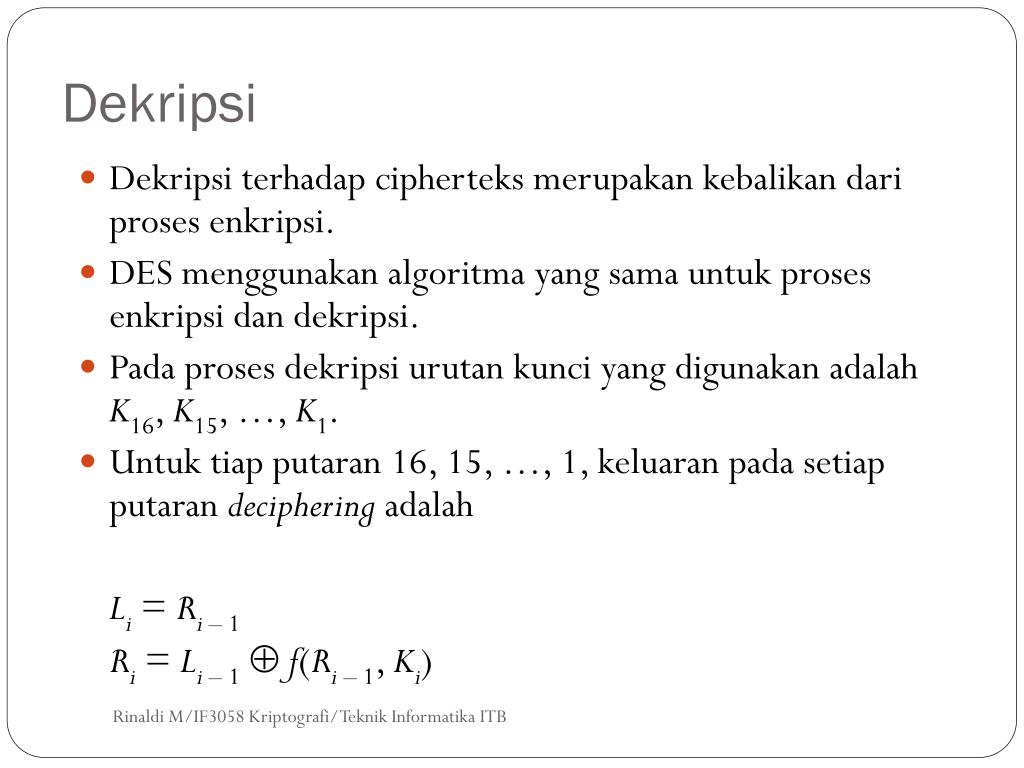 Dekripsi • Dekripsiterhadapcipherteksmerupakankebalikandariprosesenkripsi. • DES menggunakanalgoritma yang samauntukprosesenkripsidandekripsi. • Padaprosesdekripsiurutankunci yang digunakanadalahK16, K15, …, K1. • Untuktiapputaran 16, 15, …, 1, keluaranpadasetiapputarandecipheringadalah Li= Ri– 1 Ri= Li – 1f(Ri– 1, Ki) Rinaldi M/IF3058 Kriptografi/Teknik Informatika ITB