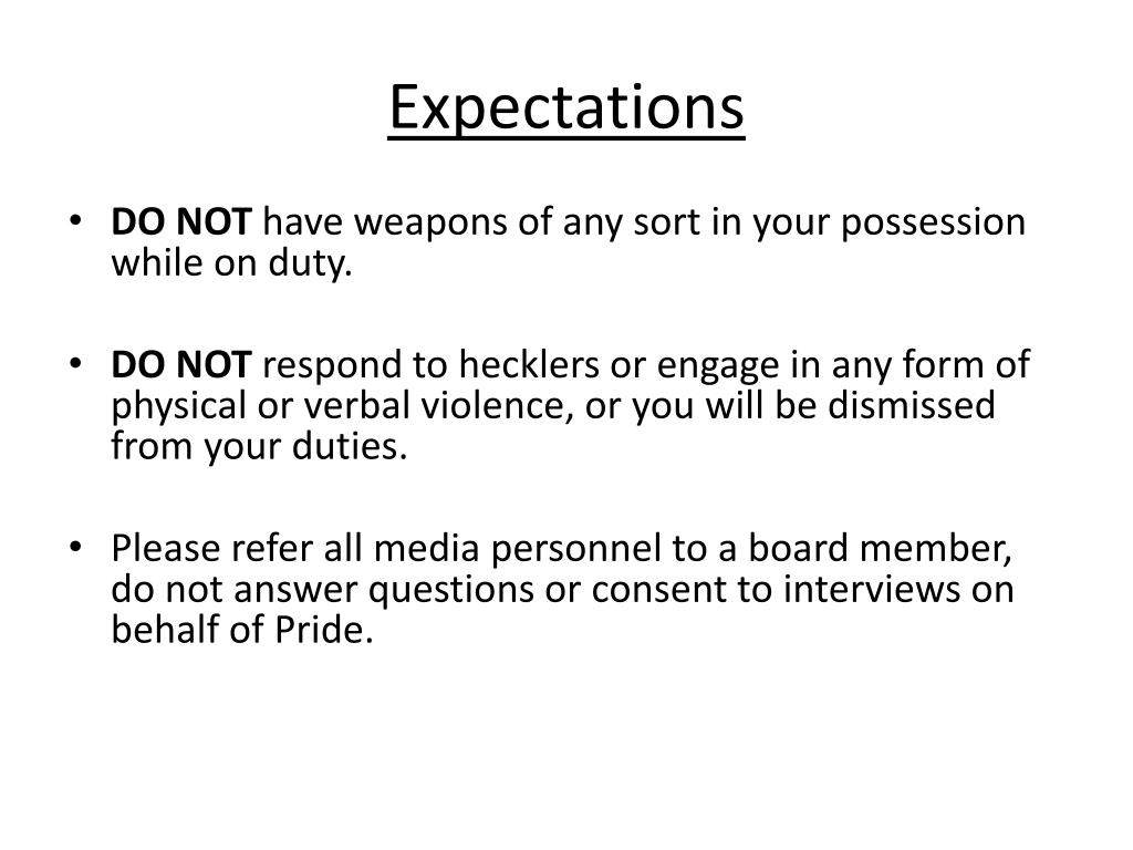Expectations • DO NOT have weapons of any sort in your possession while on duty. • DO NOT respond to hecklers or engage in any form of physical or verbal violence, or you will be dismissed from your duties. • Please refer all media personnel to a board member, do not answer questions or consent to interviews on behalf of Pride.