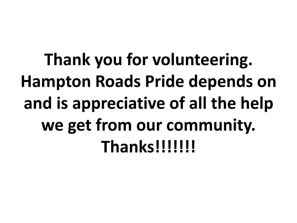 Thank you for volunteering. Hampton Roads Pride depends on and is appreciative of all the help we get from our community. Thanks!!!!!!!