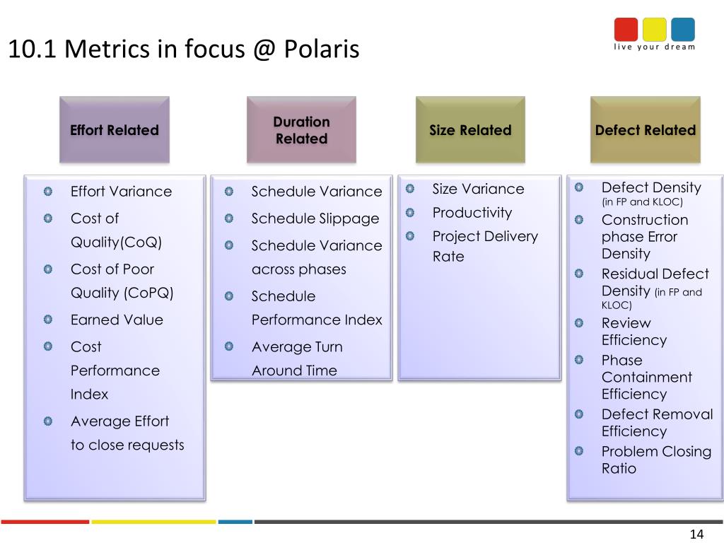 10.1 Metrics in focus @ Polaris Effort Related Duration Related Size Related Defect Related • Effort Variance • Cost of Quality(CoQ) • Cost of Poor Quality (CoPQ) • Earned Value • Cost Performance Index • Average Effort to close requests • Schedule Variance • Schedule Slippage • Schedule Variance across phases • Schedule Performance Index • Average Turn Around Time • Size Variance • Productivity • Project Delivery Rate • Defect Density (in FP and KLOC) • Construction phase Error Density • Residual Defect Density (in FP and KLOC) • Review Efficiency • Phase Containment Efficiency • Defect Removal Efficiency • Problem Closing Ratio