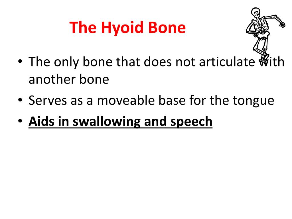 The Hyoid Bone • The only bone that does not articulate with another bone • Serves as a moveable base for the tongue • Aids in swallowing and speech