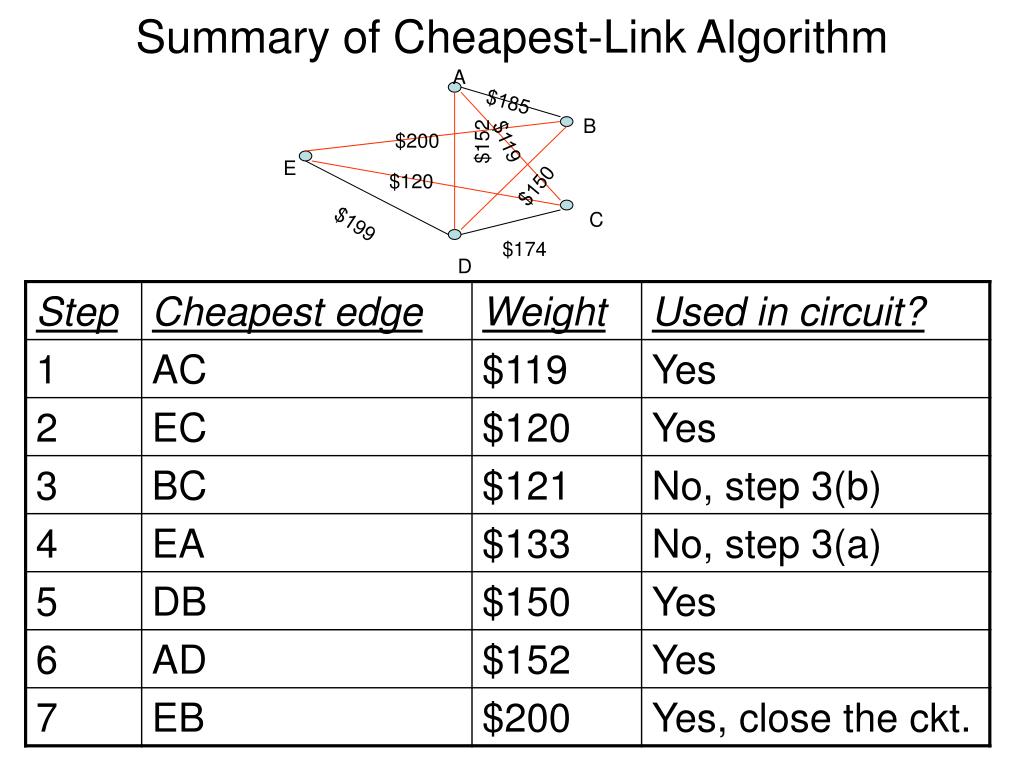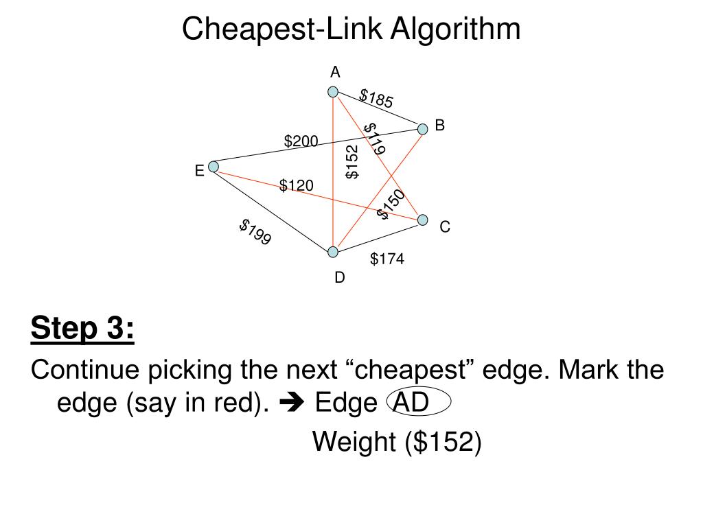 Cheapest-Link Algorithm A $185 B Step 3: Continue picking the next “cheapest” edge. Mark the edge (say in red). Edge AD Weight ($152) $119 $200 $152 E $120 $150 C $199 $174 D