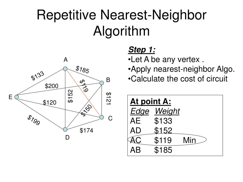 Traveling Salesman Problems Repetitive Nearest-Neighbor and Cheapest-Link Algorithms. Chapter: 6. Repetitive Nearest-Neighbor Algorithm. Let A be any vertex. Apply the nearest-neighbor algorithm using A as the starting vertex and calculate the total cost associated with the circuit.
