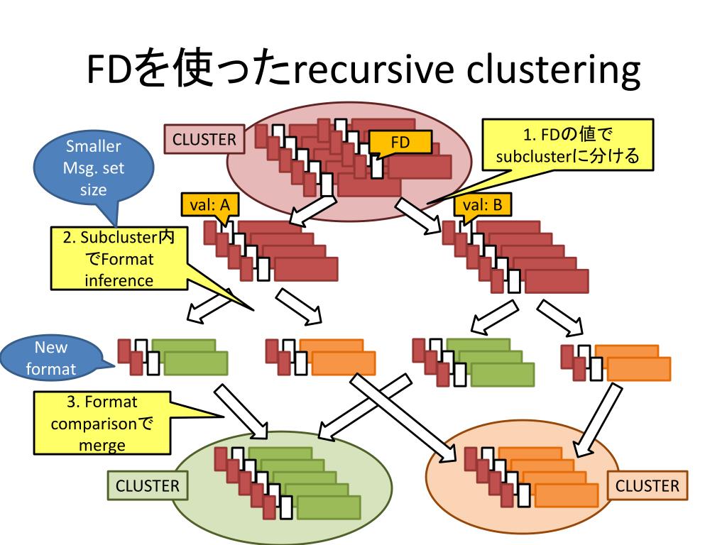 FDを使ったrecursive clustering 1. FDの値でsubclusterに分ける CLUSTER Smaller Msg. set size FD val: A val: B 2. Subcluster内でFormat inference New format 3.Format comparisonでmerge CLUSTER CLUSTER
