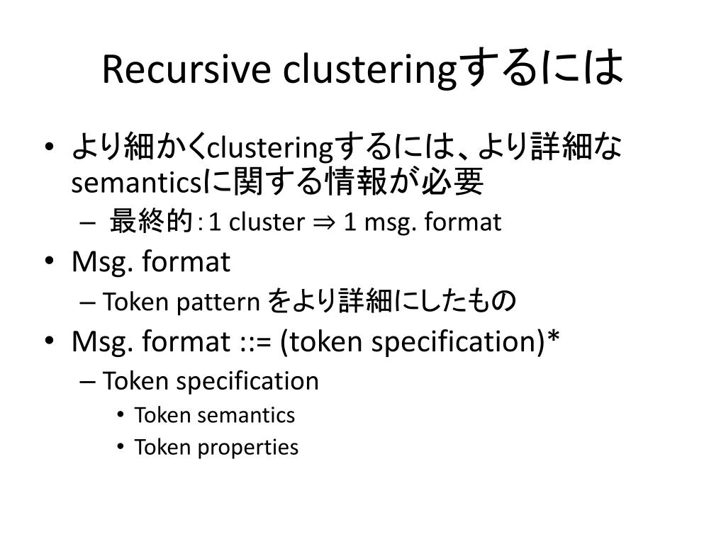 Recursive clusteringするには • より細かくclusteringするには、より詳細なsemanticsに関する情報が必要 • 最終的:1 cluster ⇒ 1 msg. format • Msg. format • Token pattern をより詳細にしたもの • Msg. format ::= (token specification)* • Token specification • Token semantics • Token properties