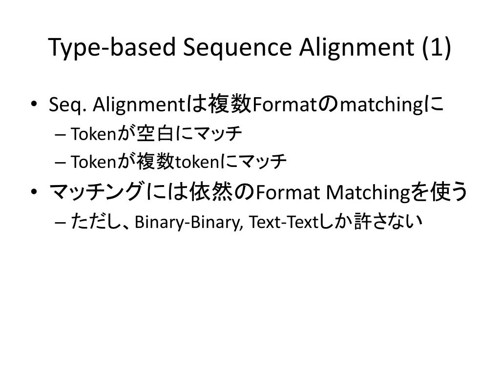 Type-based Sequence Alignment (1) • Seq. Alignmentは複数Formatのmatchingに • Tokenが空白にマッチ • Tokenが複数tokenにマッチ • マッチングには依然のFormat Matchingを使う • ただし、Binary-Binary, Text-Textしか許さない