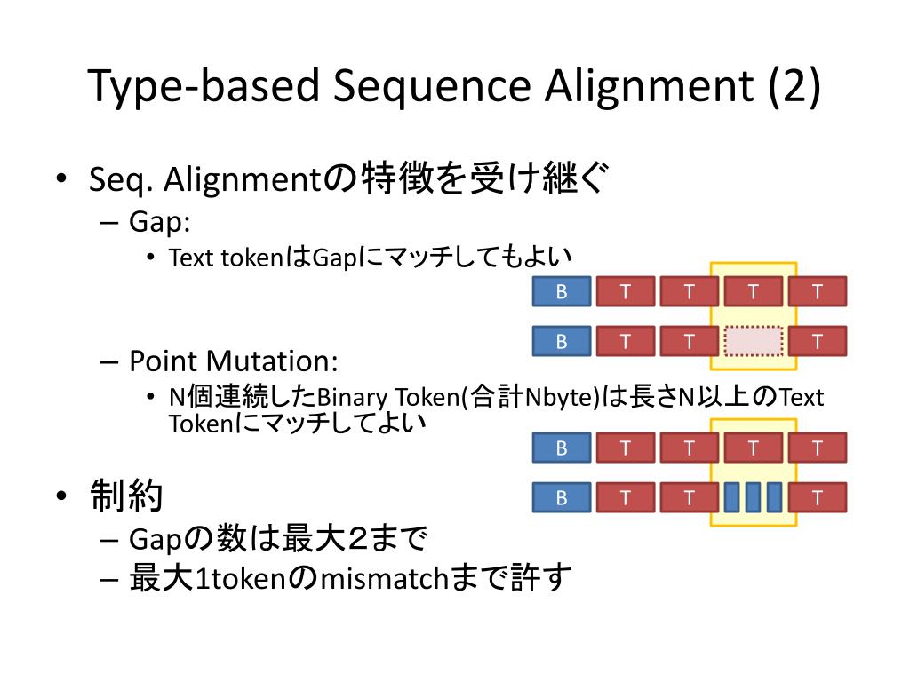 Type-based Sequence Alignment (2) • Seq. Alignmentの特徴を受け継ぐ • Gap: • Text tokenはGapにマッチしてもよい • Point Mutation: • N個連続したBinary Token(合計Nbyte)は長さN以上のText Tokenにマッチしてよい • 制約 • Gapの数は最大2まで • 最大1tokenのmismatchまで許す B T T T T B T T T B T T T T B T T T