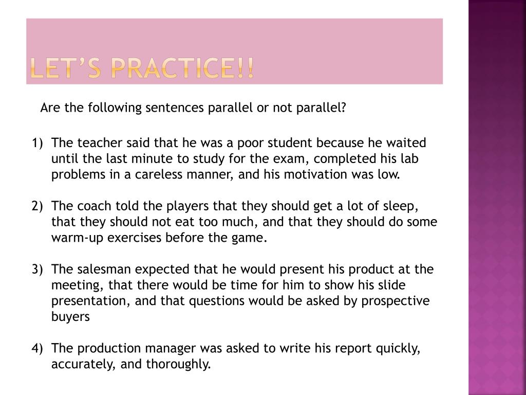Let’s Practice!! Are the following sentences parallel or not parallel? The teacher said that he was a poor student because he waited until the last minute to study for the exam, completed his lab problems in a careless manner, and his motivation was low. The coach told the players that they should get a lot of sleep, that they should not eat too much, and that they should do some warm-up exercises before the game. The salesman expected that he would present his product at the meeting, that there would be time for him to show his slide presentation, and that questions would be asked by prospective buyers The production manager was asked to write his report quickly, accurately, and thoroughly.