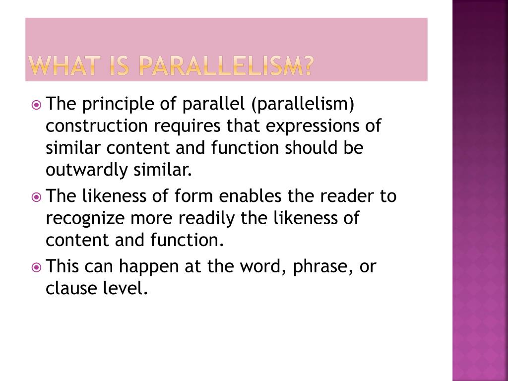 What is Parallelism? • The principle of parallel (parallelism) construction requires that expressions of similar content and function should be outwardly similar. • The likeness of form enables the reader to recognize more readily the likeness of content and function. • This can happen at the word, phrase, or clause level.