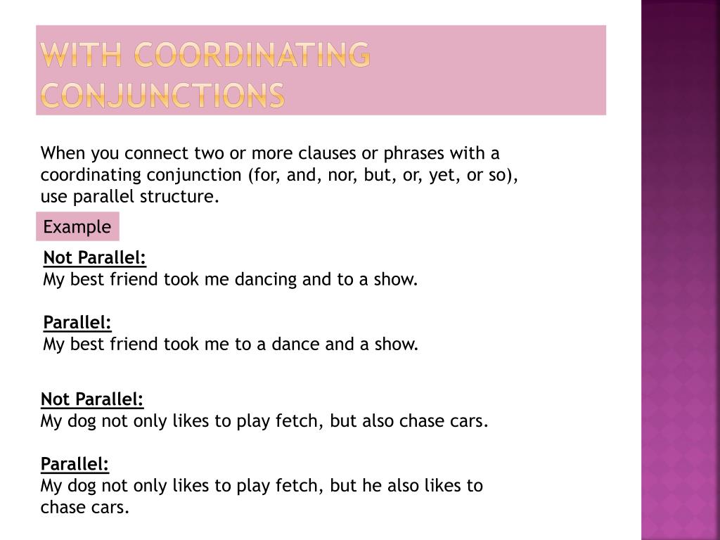 With Coordinating Conjunctions When you connect two or more clauses or phrases with a coordinating conjunction (for, and, nor, but, or, yet, or so), use parallel structure. Example Not Parallel: My best friend took me dancing and to a show. Parallel: My best friend took me to a dance and a show. Not Parallel: My dog not only likes to play fetch, but also chase cars. Parallel: My dog not only likes to play fetch, but he also likes to chase cars.