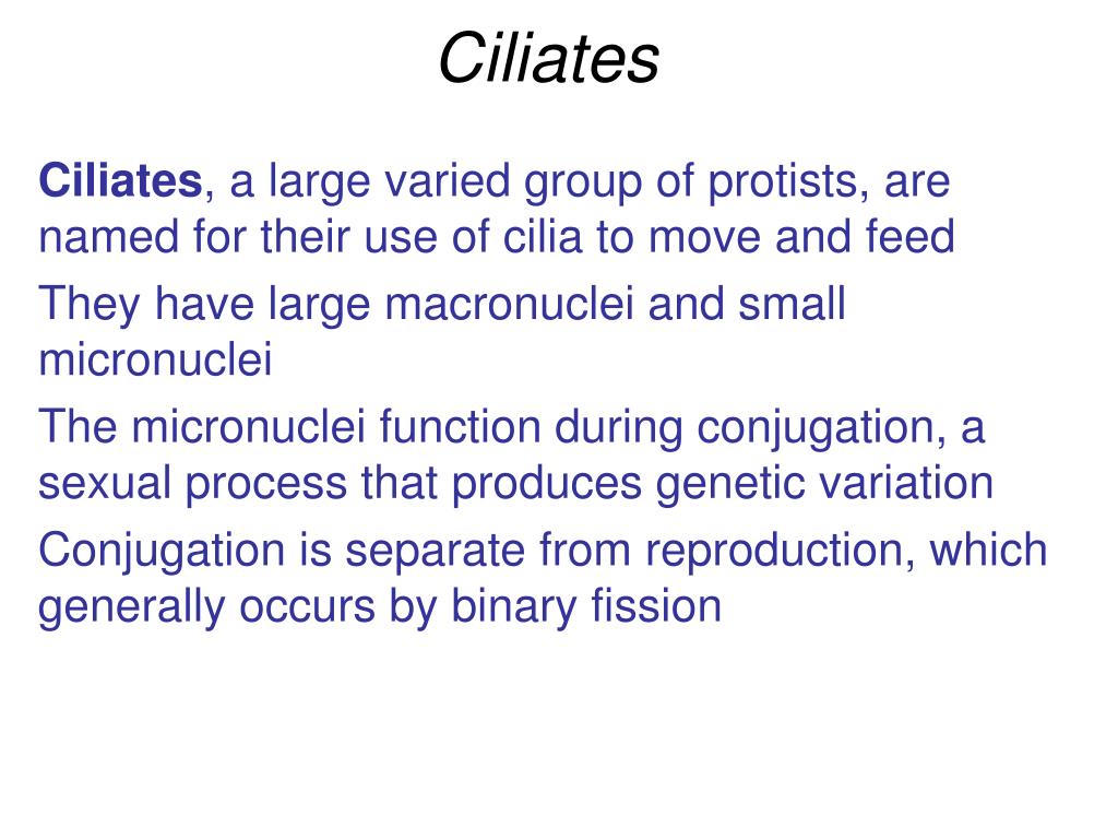 Ciliates • Ciliates, a large varied group of protists, are named for their use of cilia to move and feed • They have large macronuclei and small micronuclei • The micronuclei function during conjugation, a sexual process that produces genetic variation • Conjugation is separate from reproduction, which generally occurs by binary fission