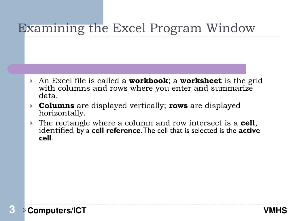 Examining the Excel Program Window • An Excel file is called a workbook; a worksheet is the grid with columns and rows where you enter and summarize data. • Columns are displayed vertically; rows are displayed horizontally. • The rectangle where a column and row intersect is a cell, identified by a cell reference. The cell that is selected is the active cell. 3 3