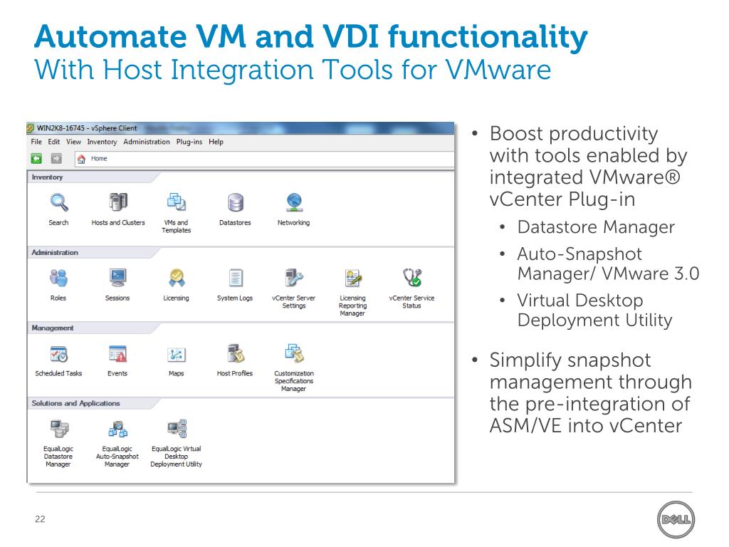 Boost productivity with tools enabled by integrated VMware® vCenter Plug-in Datastore Manager Auto-Snapshot Manager/ VMware 3.0 Virtual Desktop Deployment Utility Simplify snapshot management through the pre-integration of ASM/VE into vCenter Automate VM and VDI functionality With Host Integration Tools for VMware