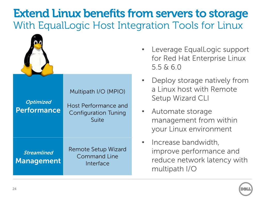 Extend Linux benefits from servers to storageWith EqualLogic Host Integration Tools for Linux • Leverage EqualLogic support for Red Hat Enterprise Linux 5.5 & 6.0 • Deploy storage natively from a Linux host with Remote Setup Wizard CLI • Automate storage management from within your Linux environment • Increase bandwidth, improve performance and reduce network latency with multipath I/O