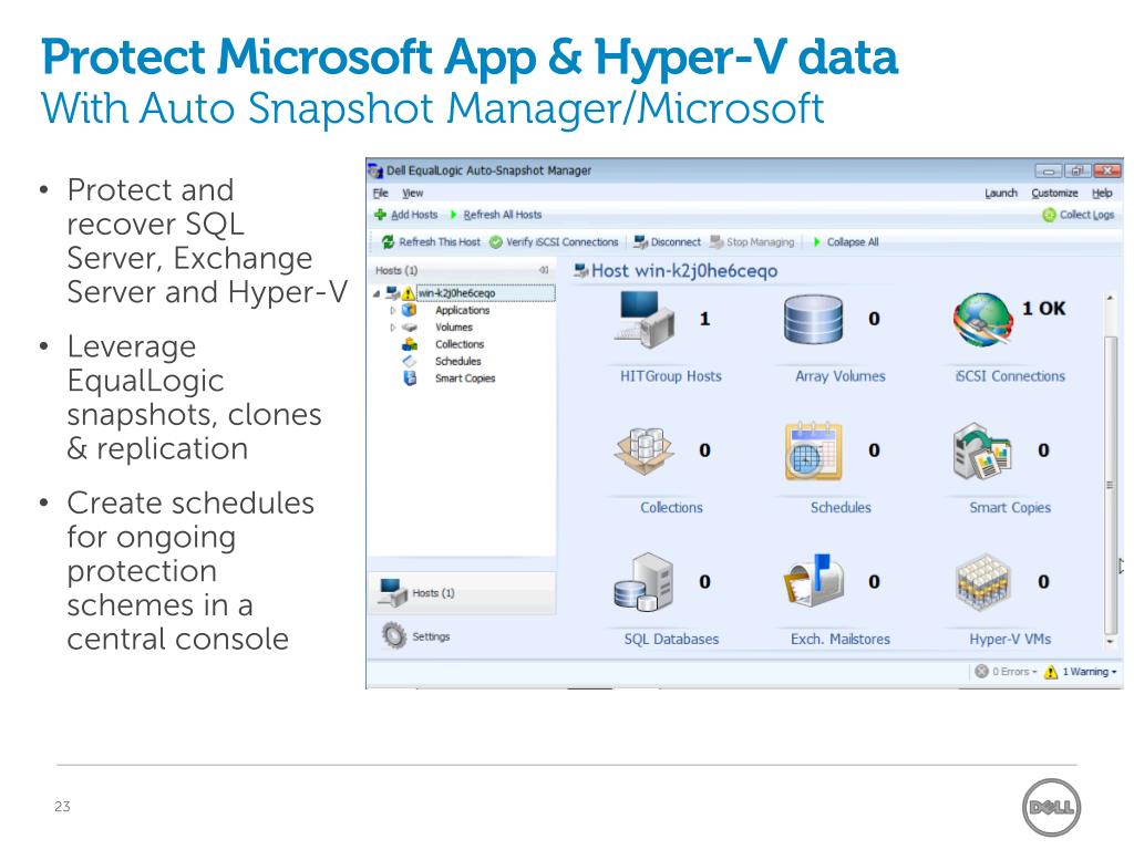 Protect and recover SQL Server, Exchange Server and Hyper-V Leverage EqualLogicsnapshots, clones & replication Create schedules for ongoing protection schemes in a central console Protect Microsoft App & Hyper-V dataWith Auto Snapshot Manager/Microsoft