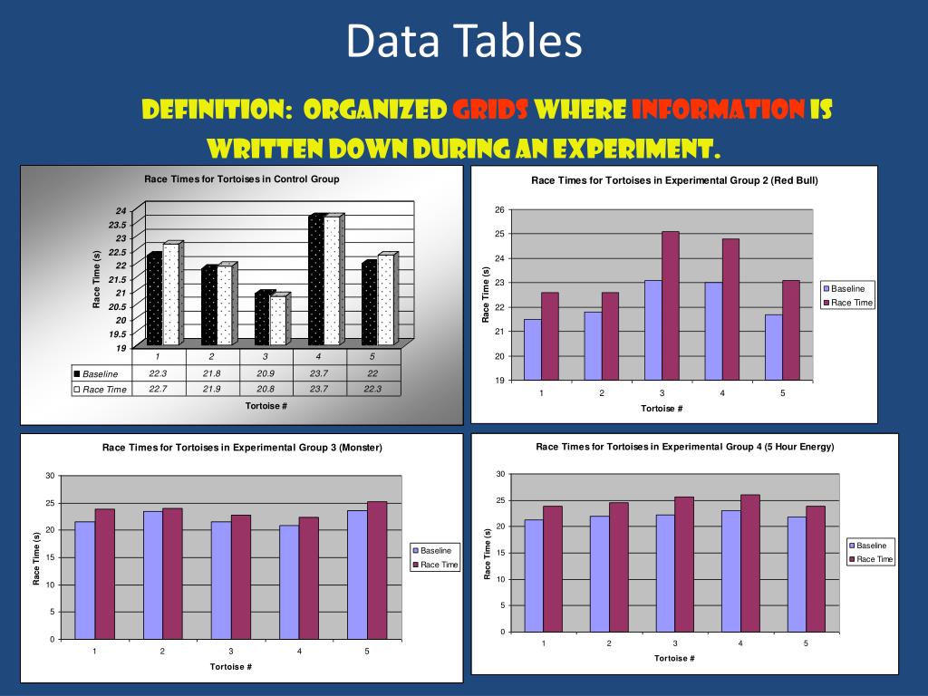 ProcedureDefinition: Step-by-step directions about how to do the experiment. • Should also include what data must be collected and how to collect it. Example procedure: • Place each group of 5 tortoises, none of which have had an energy drink, on track and allow them to finish the course. Record times. • Let the tortoises rest for 2 days. • Place the control group on the track and time their races again. Record times. • Give 50mL of the energy drink to each of the 3 experimental groups 20 minutes before their race. • Place experimental groups on the tracks one at a time and record race times. • Collect all data in a chart and compare the control group and the three experimental groups.