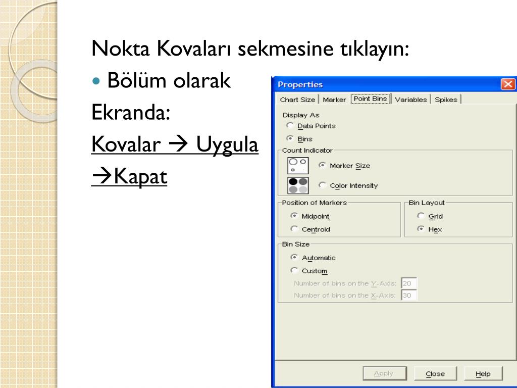 Nokta Kovaları sekmesine tıklayın: • Bölüm olarak Ekranda: Kovalar Uygula Kapat